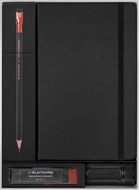 Luxusní kreativní sada Blackwing v dárkové krabici. Sada obsahuje 12 ks měkkých tužek Blackwing, skicář Moleskine, ořezávatko Blackwing a 10 ks červených a černých náhradních gum.